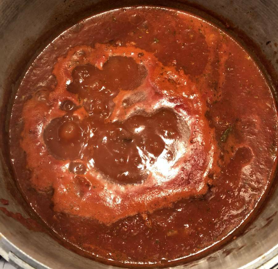 Heat the olive oil in a large pot on medium until hot. Add chopped onion and cook until softened (about 5 minutes) and add garlic. Continue to gently sauté for a few more minutes. Meanwhile, coarsely pulse the tomatoes and their juices in a blender or food processor – don’t overdo it! Add to the pot with the onions and garlic; add the tomato paste. Fill each of the tomato cans with water and add to the pot, along with salt, pepper, and dried herbs. Stir. You want it a little watery because it’s going to cook for a few hours.